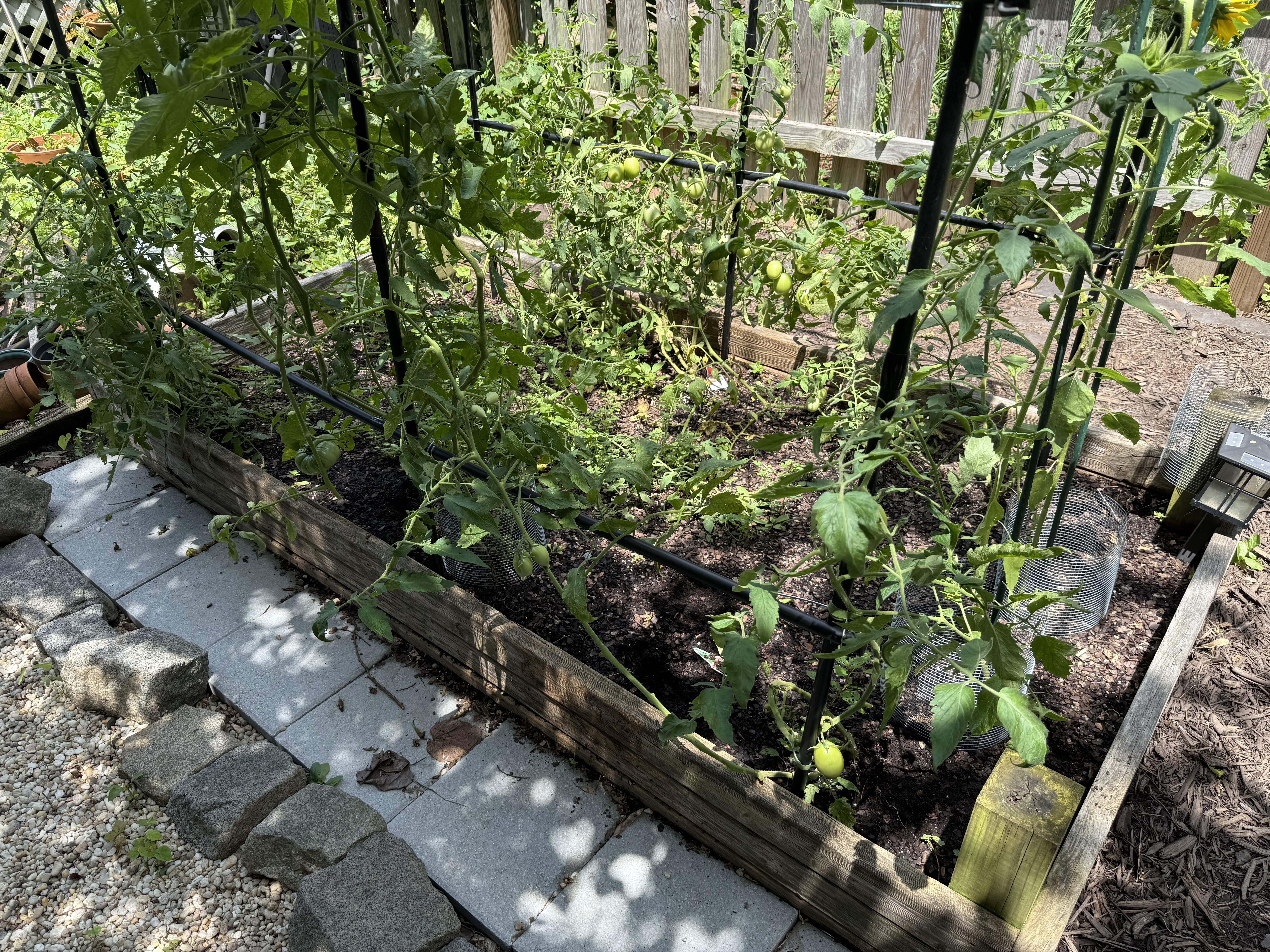 This is the (very messy) raised bed with four types of tomatoes and a few sunflowers. The sunflowers were supposed to occupy the entire interior of the bed but only the ones on the outskirts actually grew. The tomatoes did well once I cleaned them up, I just didn't have a lot of time unfortunately because at this point of the year I was working a new full-time job along with several side projects.