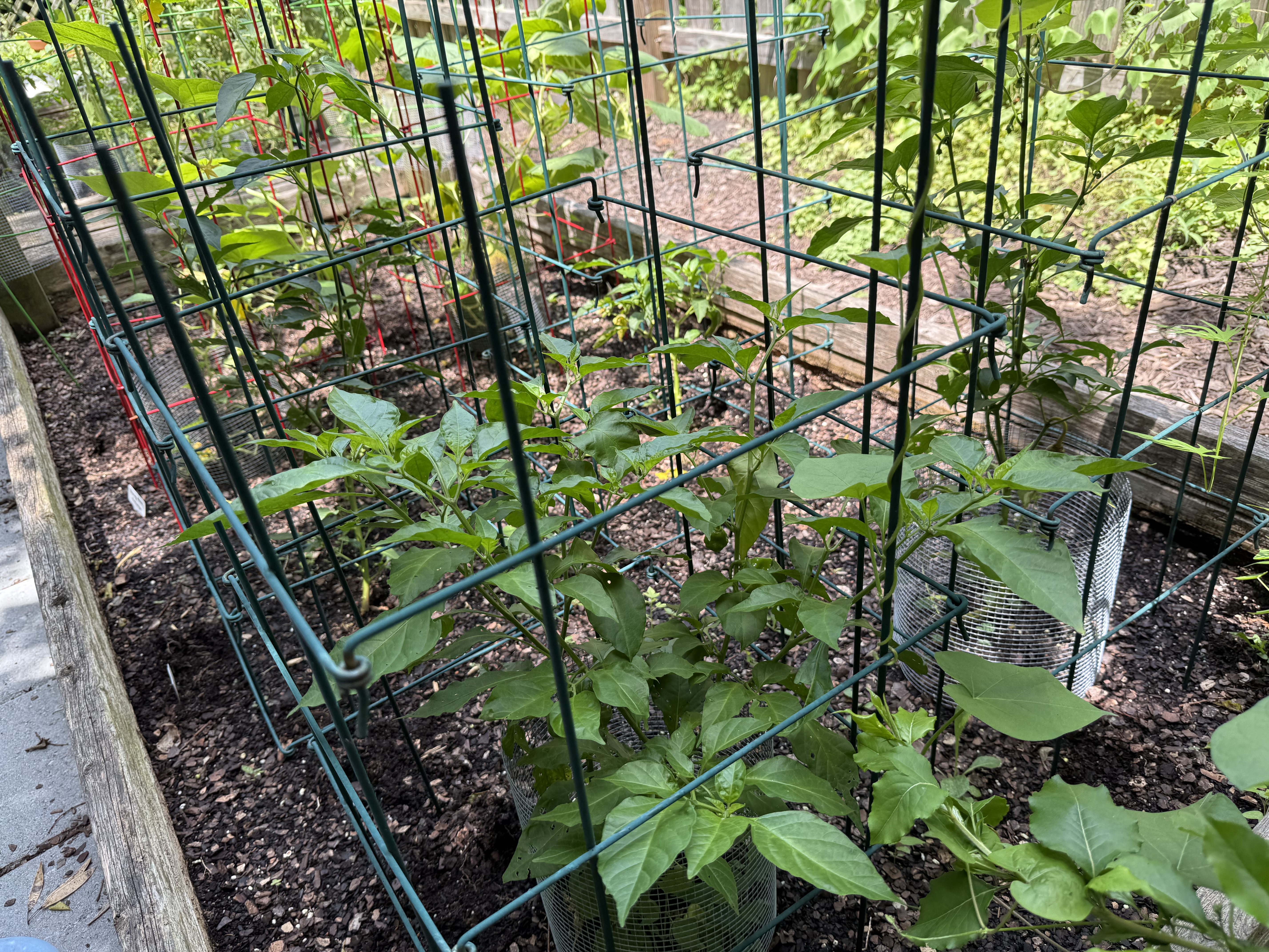 Here you can see some mid-summer progress on the hot pepper raised bed. Nothing fruiting at this point but there is jalapeño plant, a serrano plant, a tabasco plant, and an orange habanero one as well. They did quite well this year thanks to not being shaded into obscurity by cucumbers.